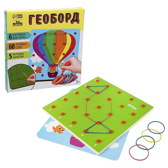 Геоборд представляет собой плоское поле (обычно в форме квадрата или прямоугольника) с равноудалёнными друг от друга штырьками. Суть игры: создавать различные фигуры, надевая на штырьки резиночки. Сначала предложите малышу повторить схемы из набора, а затем попросите придумать историю и обыграть её с помощью резиночек на геоборде.