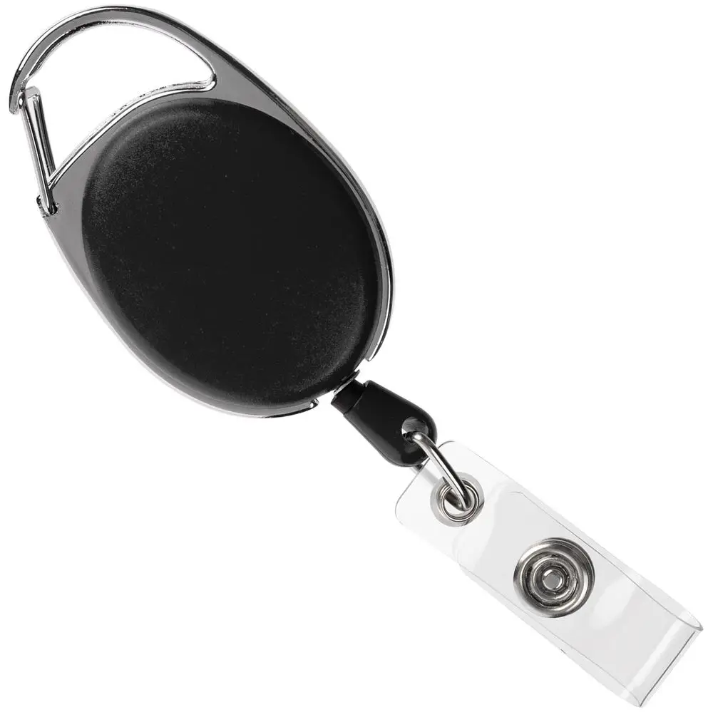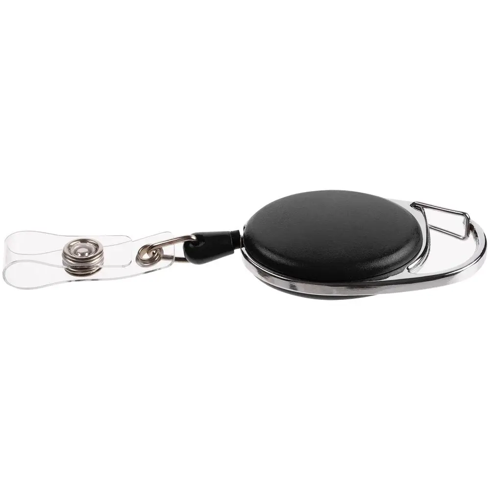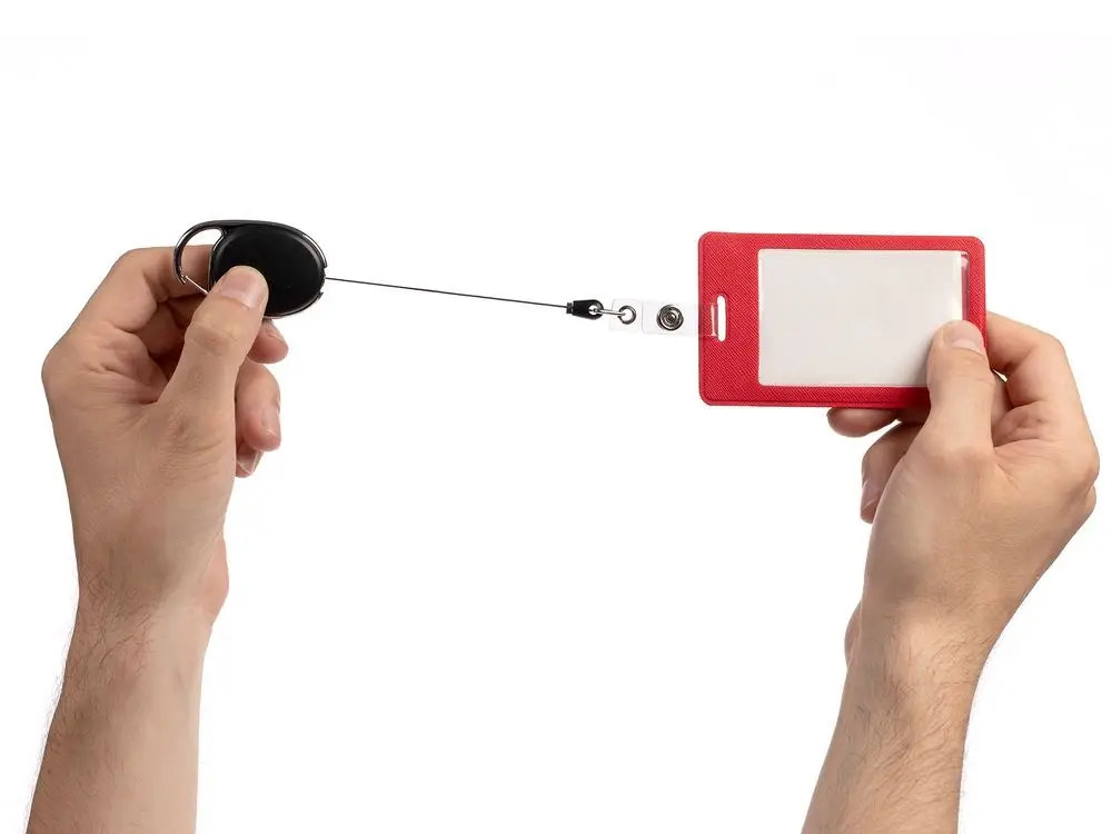 Ретрактор крепится к одежде с помощью карабина, а с другой стороны можно поместить бейдж, визитку или магнитную карту. В корпусе спрятан сворачивающийся шнур, который позволяет при необходимости демонстрировать содержимое держателя, не снимая его.