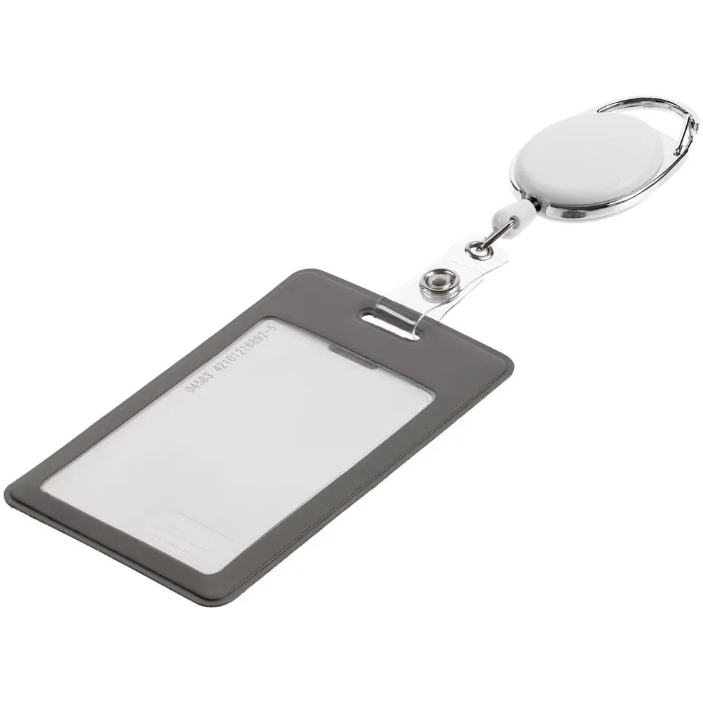 Ретрактор крепится к одежде с помощью карабина, а с другой стороны можно поместить бейдж, визитку или магнитную карту. В корпусе спрятан сворачивающийся шнур, который позволяет при необходимости демонстрировать содержимое держателя, не снимая его.
