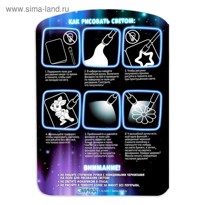 С помощью специального маркера ребёнок научится рисовать светом. Малыш будет создавать картинки, используя трафареты, или придумает собственные сюжеты.