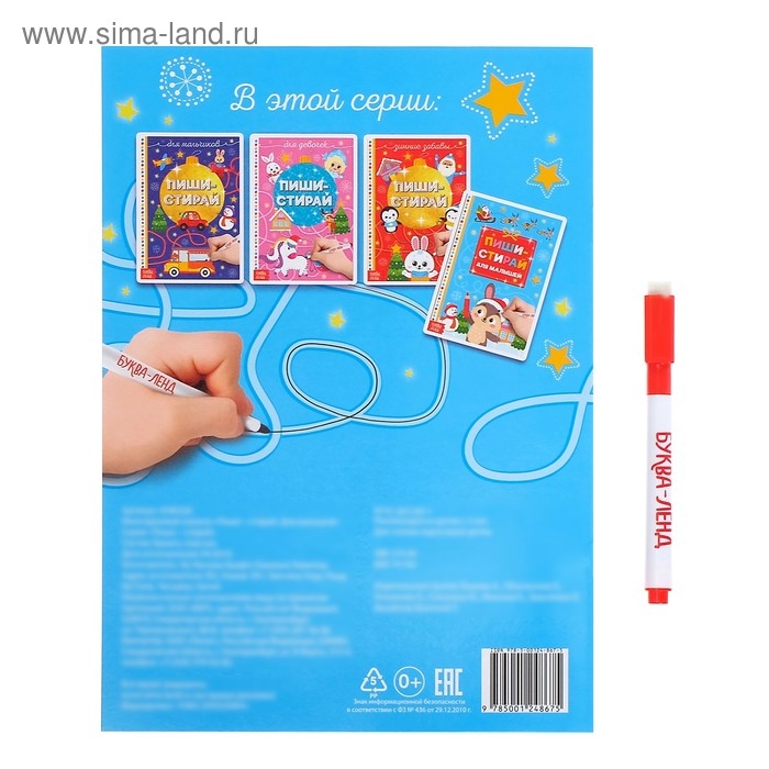 Многоразовая книжка «Пиши-стирай» предназначена для первых уроков малыша и подойдёт для занятий с детьми от 2 лет.