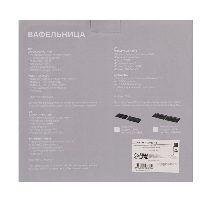 Электровафельница Luazon LT-09, 750 Вт, венские вафли, антипригарное покрытие, черная