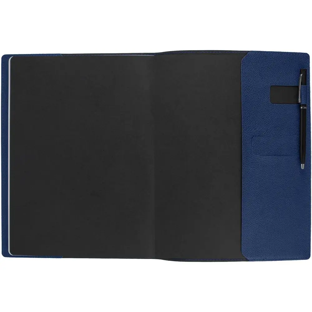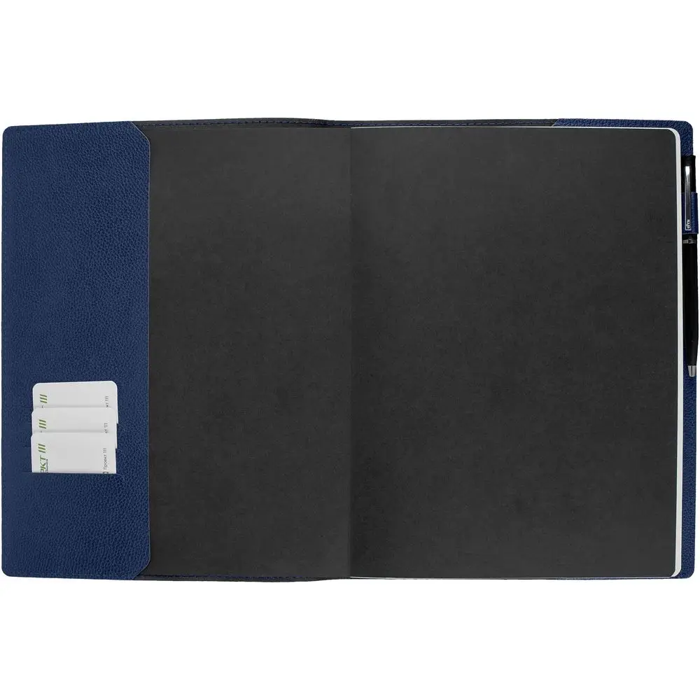 Ежедневник в суперобложке выполнен из материала La Fite, синий НН, дополнен ляссе и капталом черного цвета.