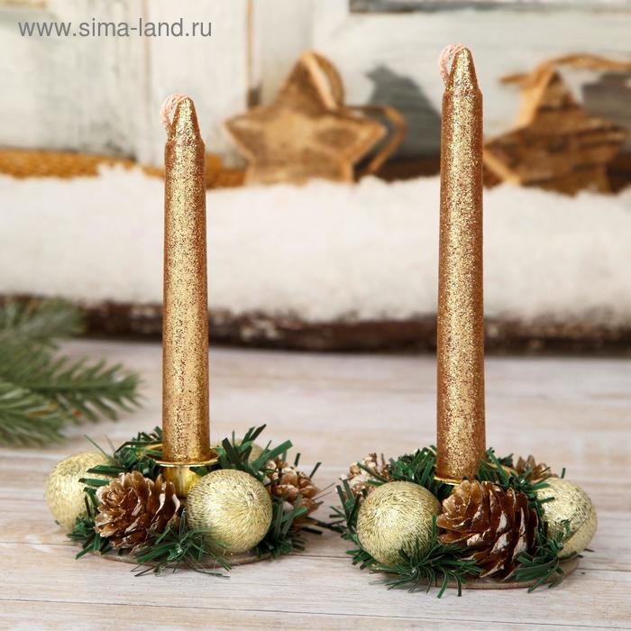 Свеча новогодняя с подсвечником "Шишки и шарики" (набор 4 шт) 3,5х11х15 см, золото