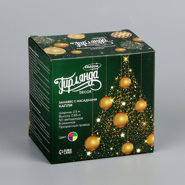 Гирлянда «Занавес» 2.5 × 0.65 м с насадками «Капли», IP20, прозрачная нить, 50 LED, свечение мульти, 8 режимов, 220 В