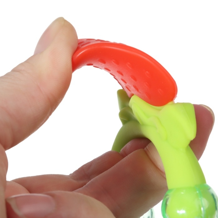 Форма ручки и размеры разработаны специально для детской ладони, поэтому малышу будет удобно её держать. Рельефная структура на поверхности изделия и его дополнительных элементов будет способствовать развитию мелкой моторики и помогут массажировать десна малыша, а яркие цвета — будут способствовать формированию визуального восприятия мира. Погремушка в прорезывателях поможет привлечь внимание малыша и будет способствует развитию слухового восприятия.