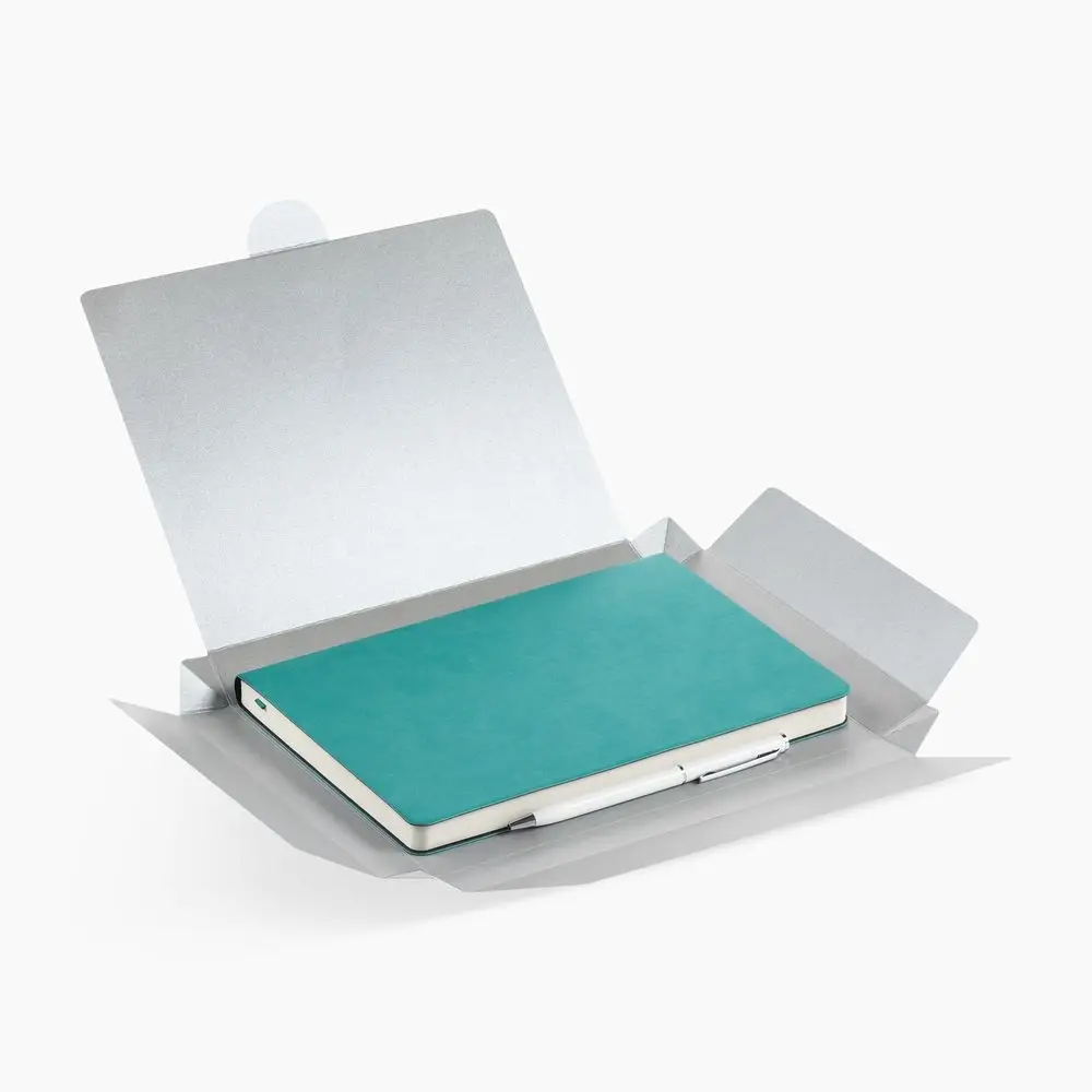 Недатированный ежедневник с гибкой обложкой из материала Latte с ляссе в цвет обложки, а также ручка в тон — в подарочной коробке из дизайнерского картона.