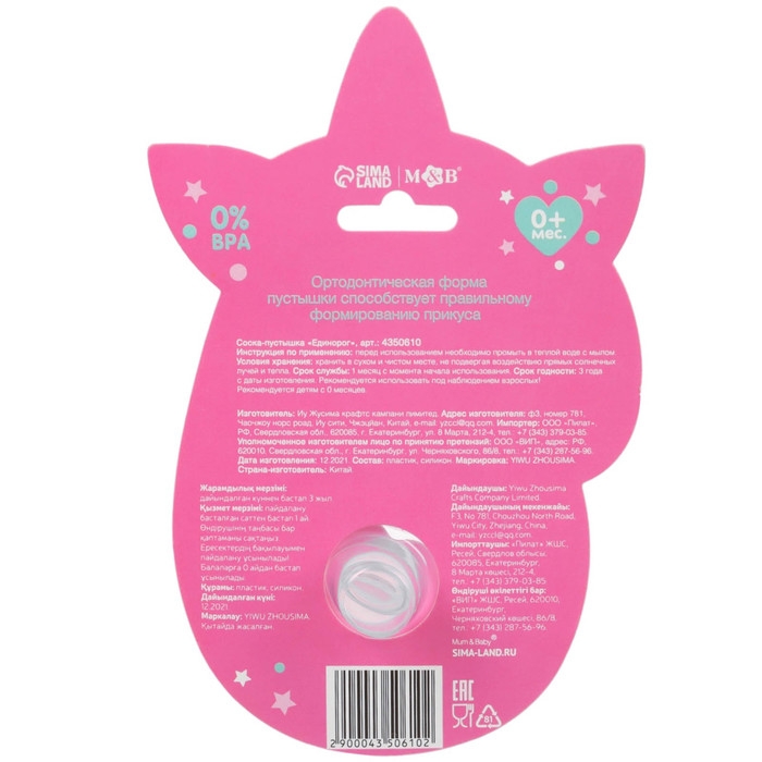 Соска - пустышка силиконовая ортодонтическая «Единорог», от 0 мес., цвет розовый