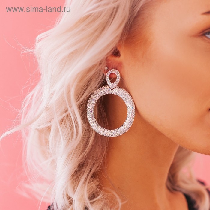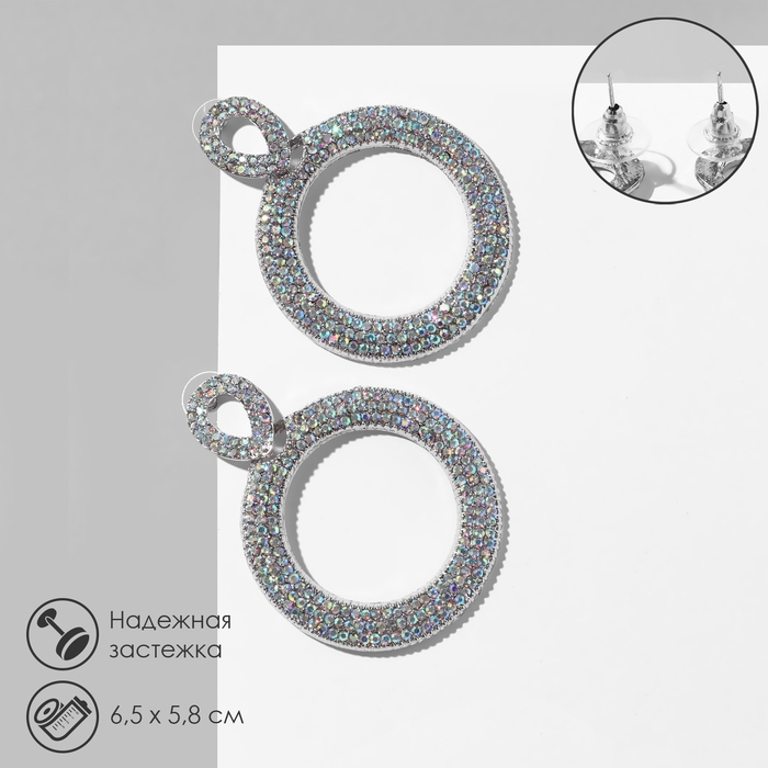Серьги висячие со стразами «Эдем» кольцо, радужный в серебре, 6,5 см