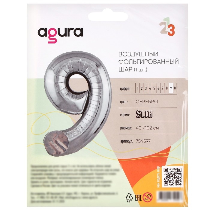 Шар фольгированный 40" «Цифра 9», цвет серебряный, Slim