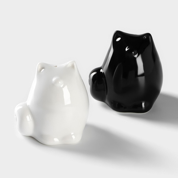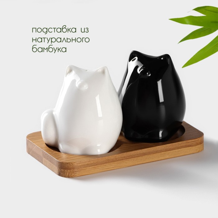 Набор фарфоровый для специй на бамбуковой подставке BellaTenero «Котики», 3 предмета: солонка, перечница, подставка, цвет белый и чёрный