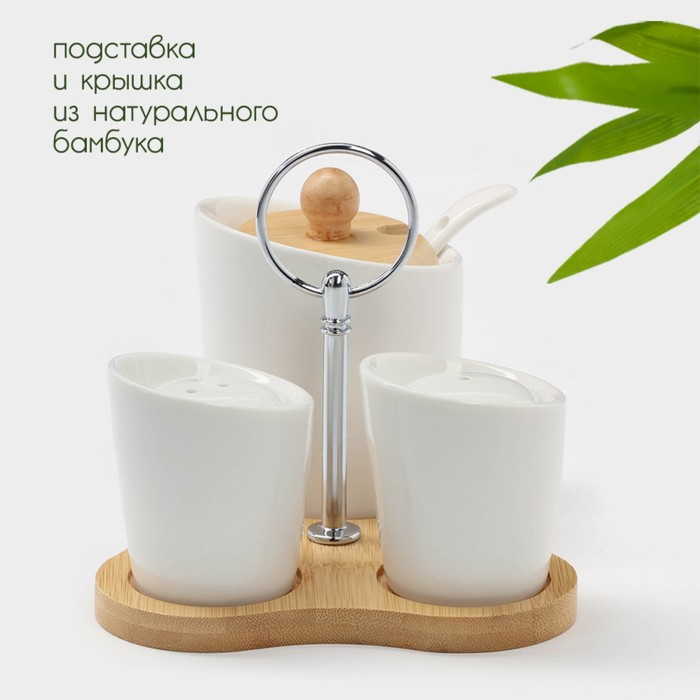 Набор фарфоровый для специй на бамбуковой подставке BellaTenero, 3 предмета: солонка 90 мл, перечница 90 мл, подставка, цвет белый