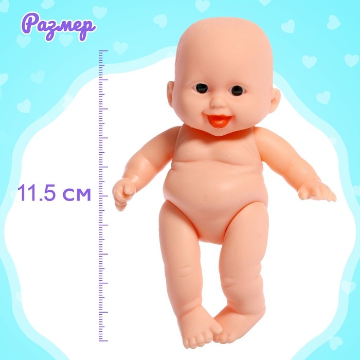 У куклы двигаются руки, ноги. Ребёнок придумает множество игр с пупсом и будет учиться заботе и ответственности. Рост куклы — 12 см. Её можно купать. Игрушка выполнена из пластика.