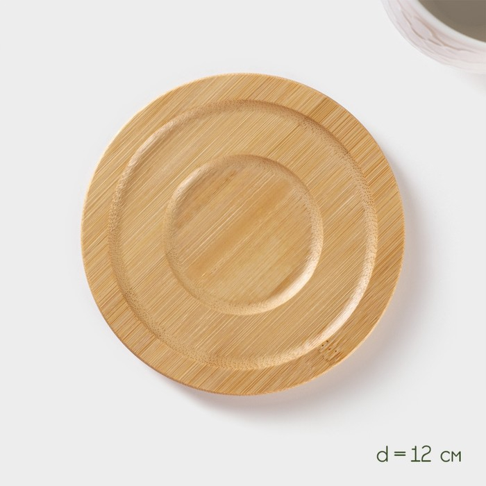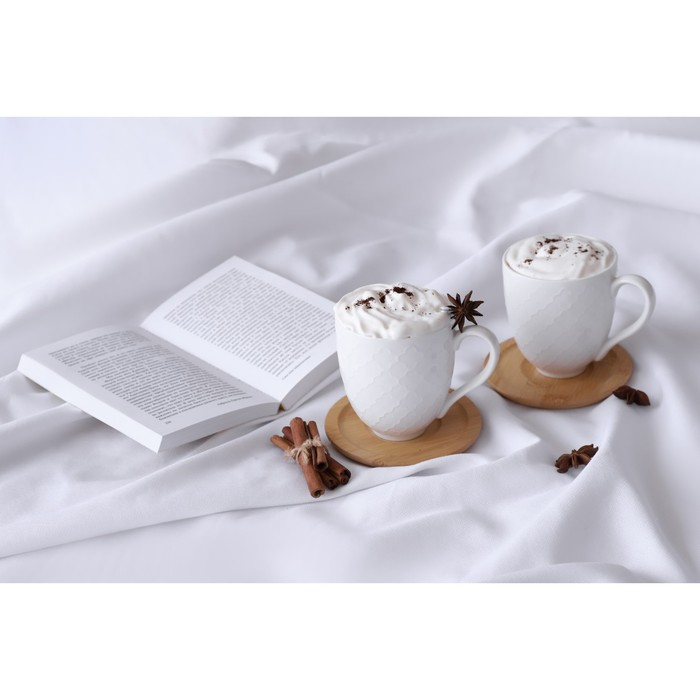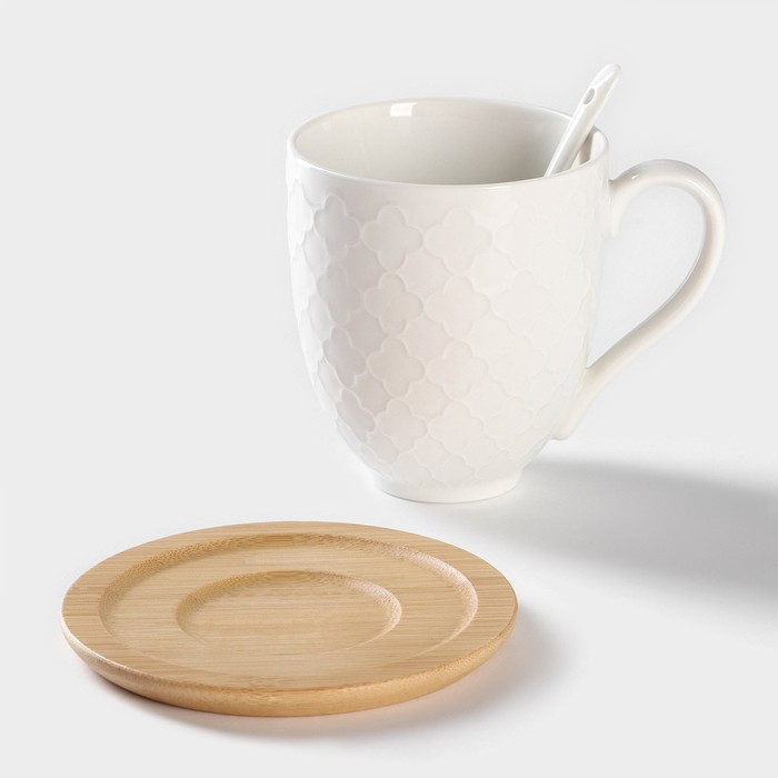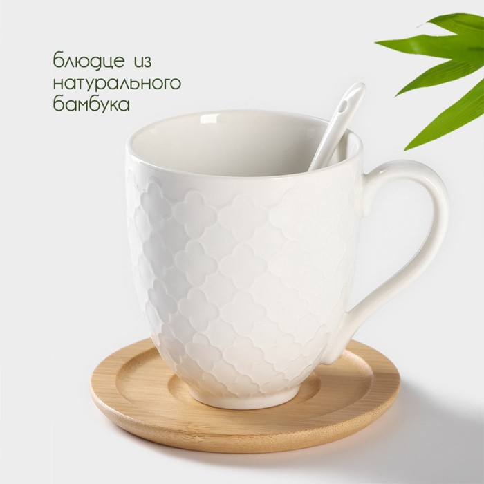 Набор керамический чайный на бамбуковой подставке BellaTenero, 6 предметов: 2 чашки 350 мл, 2 деревянных блюдца d=12 см, 2 ложки, цвет белый