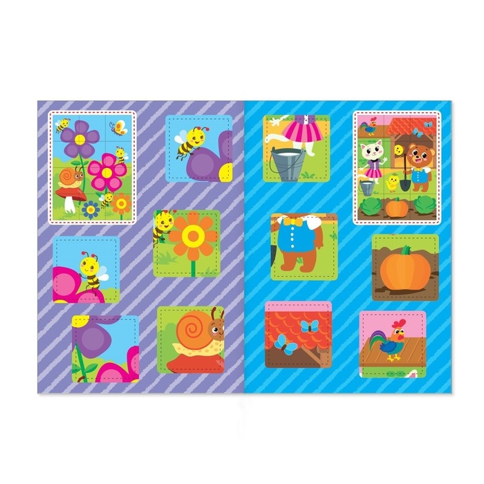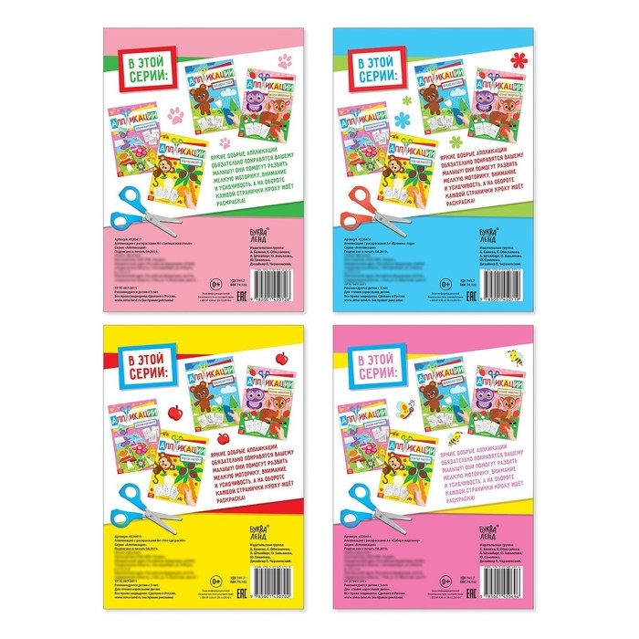 В этом наборе ребёнка ждут объёмные аппликации. Его задача: вырезать фигурки из бумаги и приклеить их на основу. В итоге из каждой книги получится по 4 готовых картинки.