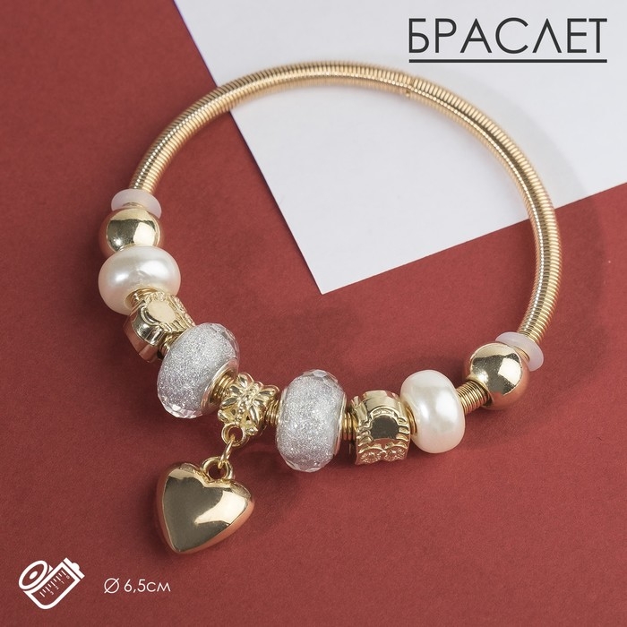 Браслет с жемчугом «Марджери» сердце, цвет серебристо-белый в розовом золоте, d=6,5 см