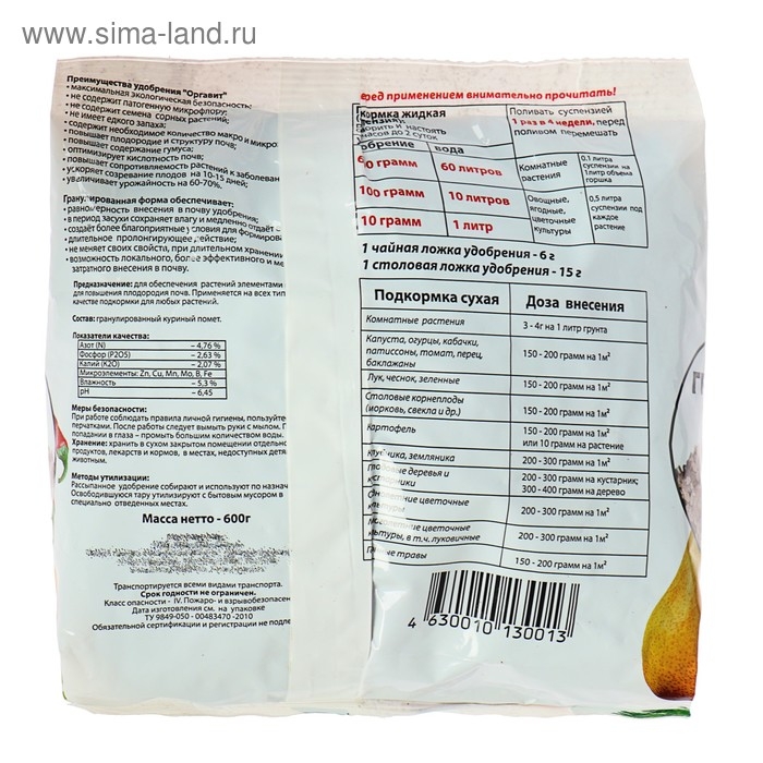 Плодовые деревья и кустарники - 200-300 грамм на кустарник, 300-400 грамм на дерево при подготовке посадочной ямы и ежегодно весной под перекопку почвы в приствольном круге, начиная со следующего года после посадки Однолетние цветочные культуры - 200-300грамм на 1м2 под перекопку или предпосевное рыхление почвы Многолетние цветочные культуры, в т.ч. луковичные - 200-300грамм на 1м2 при подготовке посадочной ямы и ежегодно весной под перекопку почвы, начиная со следующего года после посадки Газонные травы - 150-200грамм на 1м2 при подготовке почвы к посеву.| Наименование | Артикул | Бренд | Мин кол-во | Цена | Продажи | |||