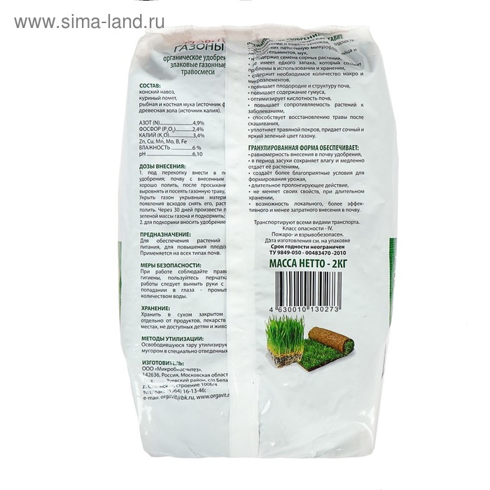 Удобрение гранулированное органическое Оргавит Газоны, 2 кг