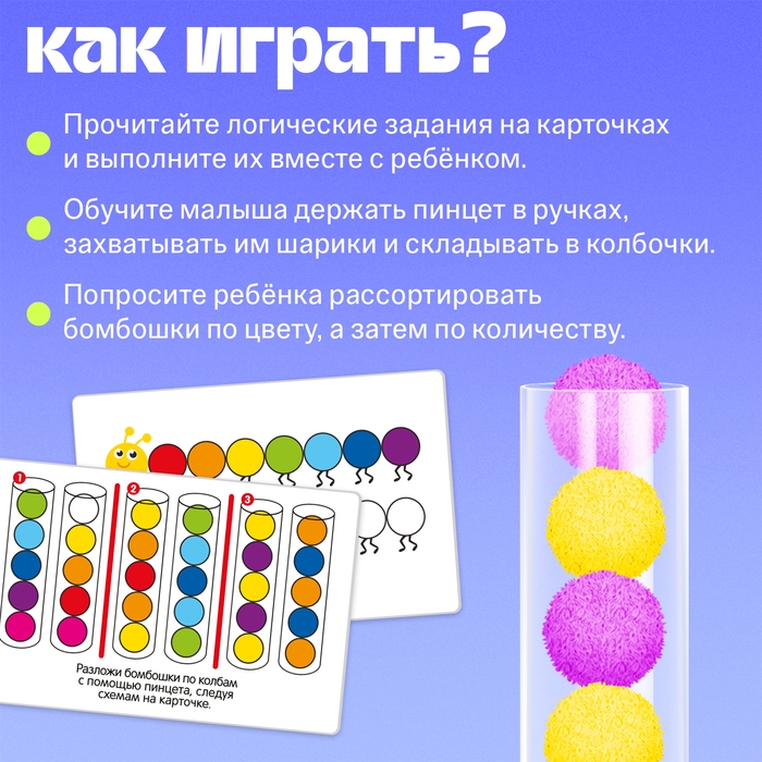 Развивающий набор «Цветные бомбошки: сложи по образцу» рекомендован детям старше 3 лет.