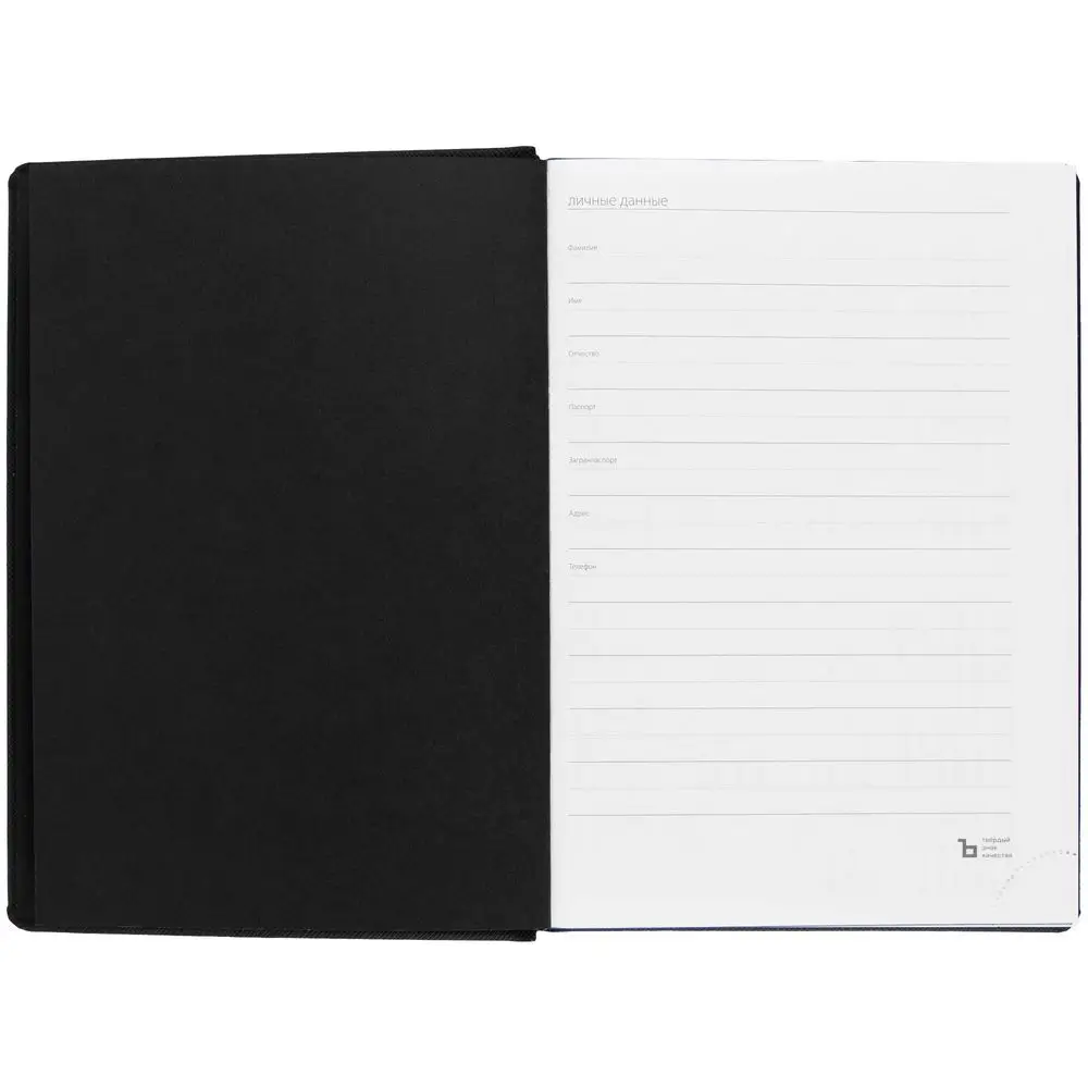 Твердая обложка выполнена из материалов Nice Touch, черный АА, и Canyon, синий НН. Ежедневник дополнен капталом, резинкой для ручки и ляссе черного цвета.