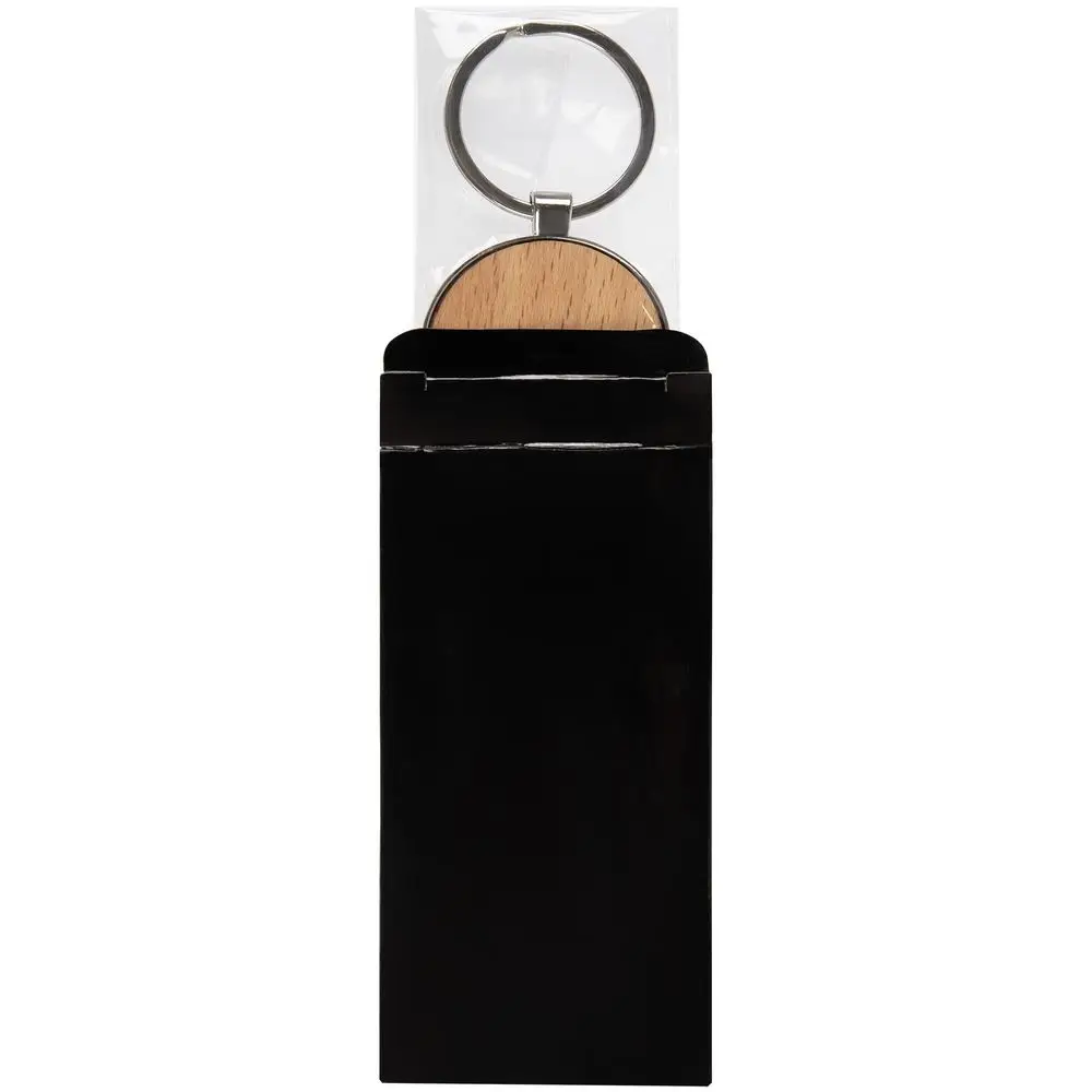 Металлический брелок-медальон со вставкой из натурального дерева. Подойдет для клиентов, отдающих предпочтение качественным натуральным материалам.