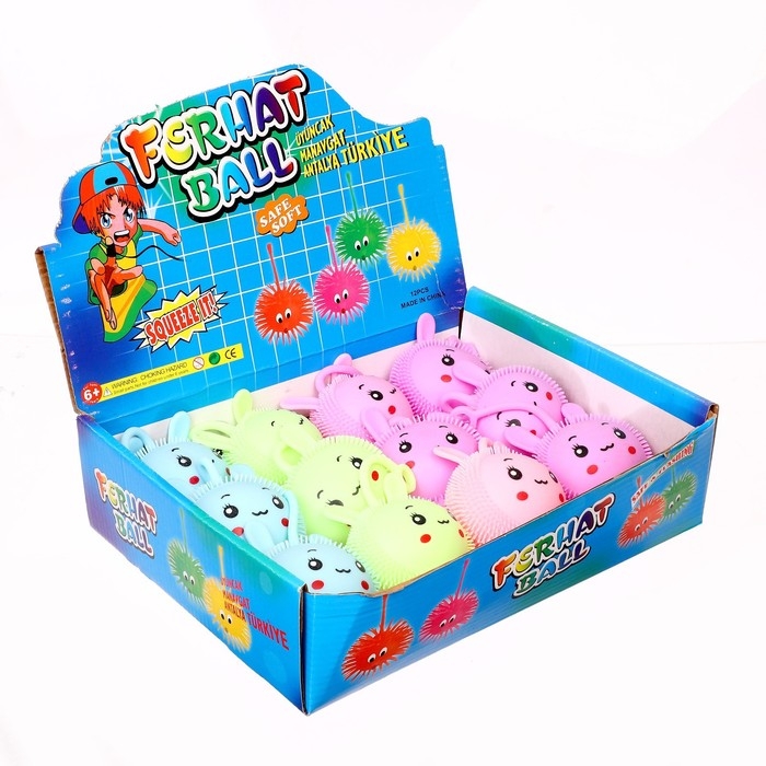 - У озорного пушистика есть резиновая верёвочка, а внутри находится шарик. Он светится и мигает при ударе, что очень зрелищно выглядит в темноте.