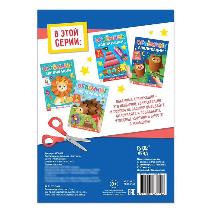 Аппликации объёмные «Совушки» — 20 страниц удовольствия для вашего ребёнка и 4 поделки, собранные своими руками. Морские животные, лесные обитатели, цветы и много всего интересного вы встретите на просторах этой книги. На каждой странице подробно описаны правила создания аппликации. Для удобства в книге есть условные обозначения необходимых действий: вырезать, согнуть, завить ножницами, нанести клей.