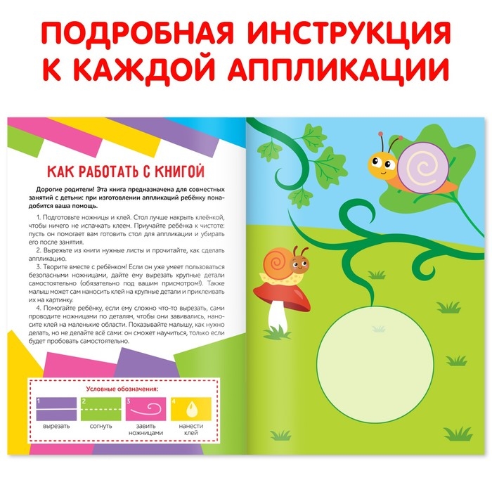 На каждой странице подробно описаны правила создания аппликации. Для работы малышу потребуются ножницы, клей и ваша помощь. Для удобства в книге есть условные обозначения необходимых действий: вырезать, согнуть, завить ножницами, нанести клей.