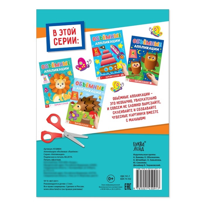 Аппликации объёмные «Львёнок» — 20 страниц удовольствия для вашего ребёнка и 4 поделки, собранные своими руками. Здесь он познакомится с рыбкой и осьминожкой, весёлыми зверушками и птичками, спелыми фруктами и ягодами.