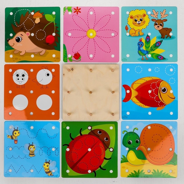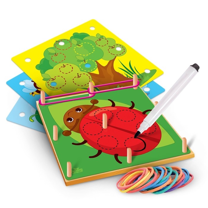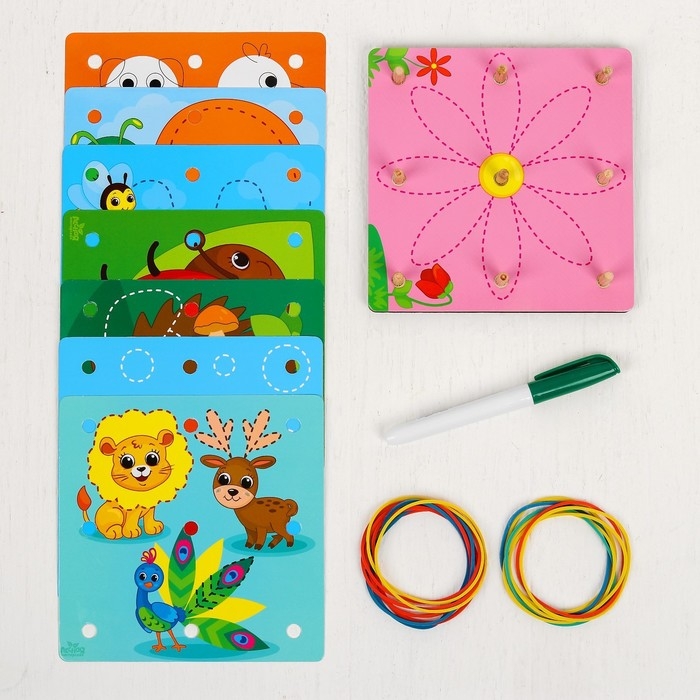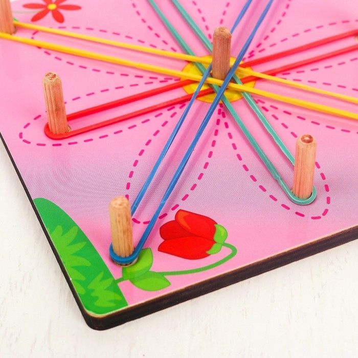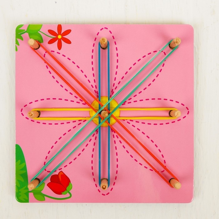 Геоборд представляет собой плоское поле (обычно в форме квадрата или прямоугольника) с равноудалёнными друг от друга штырьками. Суть игры - создавать различные фигуры, надевая на штырьки резиночки. Сначала предложите малышу повторить схемы из набора, а затем попросите придумать историю и обыгрывать её с помощью резиночек на геоборде.