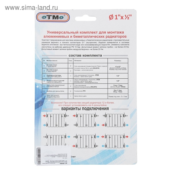 Комплект для подключения радиатора OTMO, 1 х 1/2", с двумя кронштейнами, в блистере