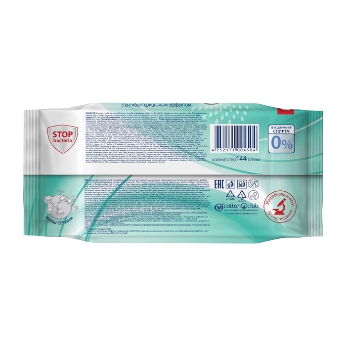 Влажные салфетки AURA FAMILY, с антибактериальным эффектом 144 шт.