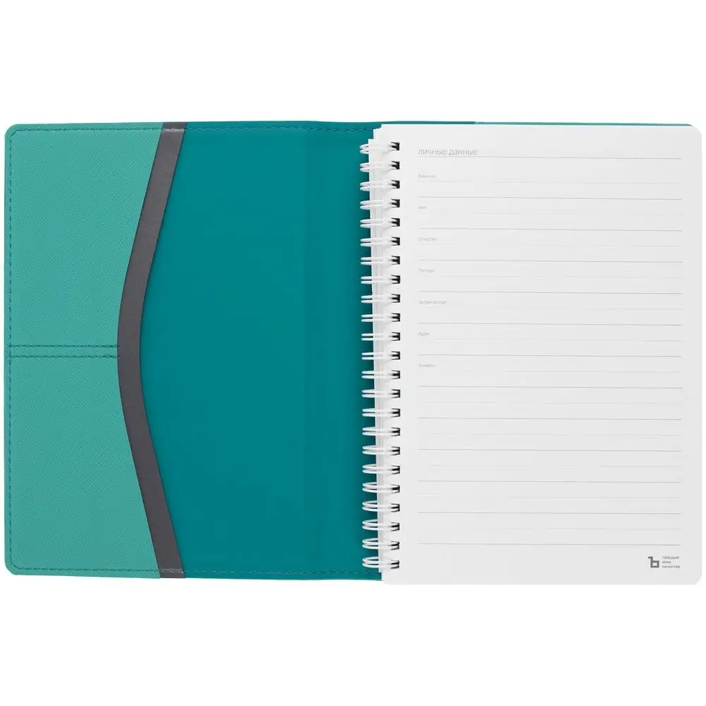 Ежедневник с блоком на пружине в твердой обложке, выполнен из материалов Nice Touch, цвет морской волны и Soft Touch Pearl серый.
