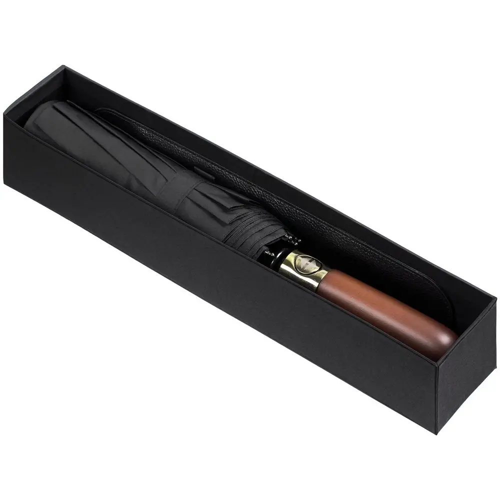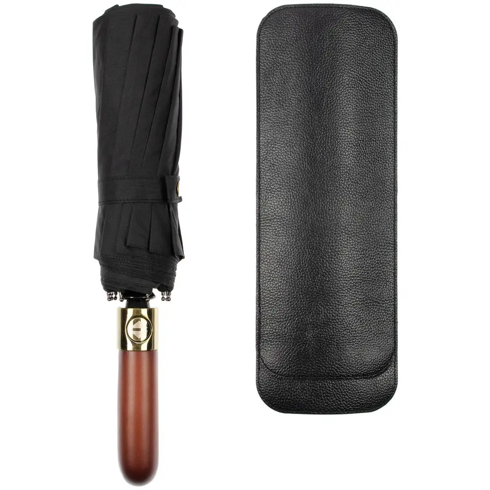 Складной зонт с большим куполом, системой антишторм и эргономичной ручкой из дерева.