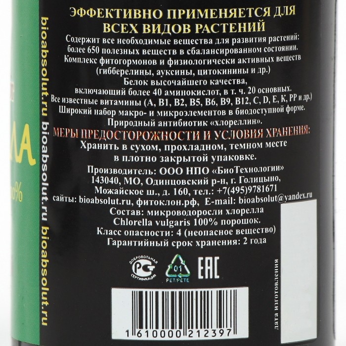 Эффективно применяется для всех видов растений. Хлорелла органический природный стимулятор роста растений, способствующий активному формированию корневой системы, завязи. Дополнительно улучшает внешний вид культуры, сокращает время развития и затраты на уход. Идеально подходит для полива и опрыскивания рассады, улучшает ее приживаемость при пересадке до 100проц. Предотвращает множество заболеваний и укрепляет иммунитет растений! Содержит все необходимые вещества для развития живой здоровой клетки! Уничтожает патогенную микрофлору и обогащает почву! В целях профилактики возможных заболеваний рекомендуется раз в месяц опрыскивать растения водным раствором хлореллы. Состав микроводоросли хлорелла Chlorella vulgaris 100проц. порошок.