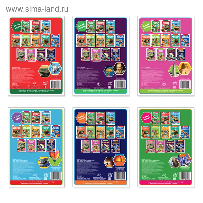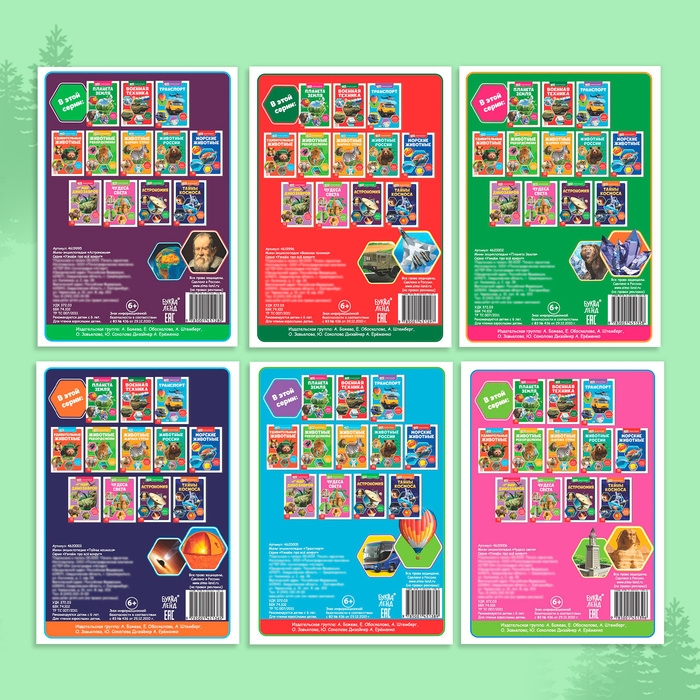 Набор мини-энциклопедий «Познаём всё вокруг» — полезный подарок для вашего почемучки! В него входят уникальные книжки на самые важные темы: «Астрономия», «Транспорт», «Планета Земля», «Военная техника», «Чудеса света», «Тайны космоса».
