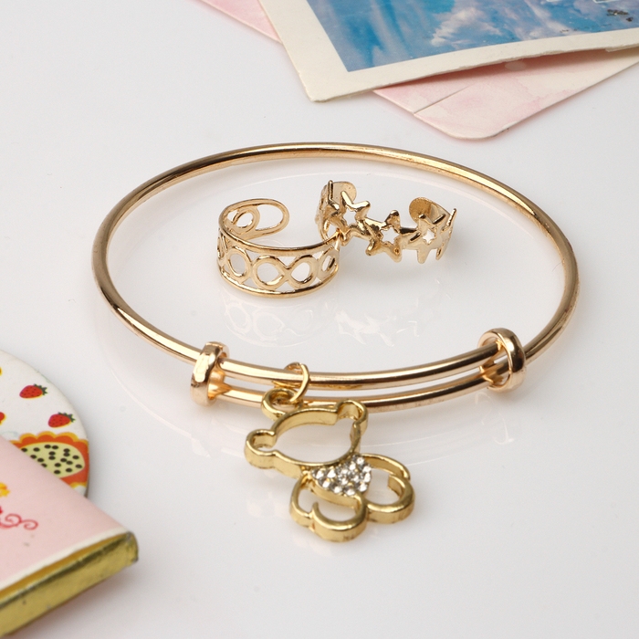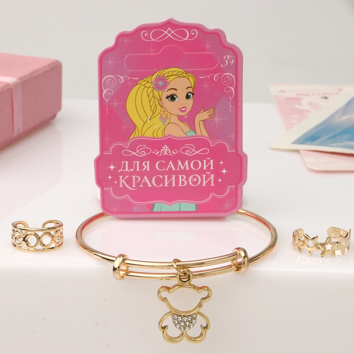 Набор детский «Выбражулька» 3 предмета: браслет, 2 кольца, медвежонок, цвет белый в золоте