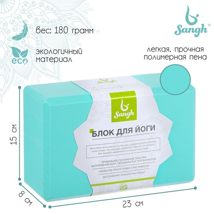 Блок для йоги Sangh, 23х15х8 см, цвет мятный