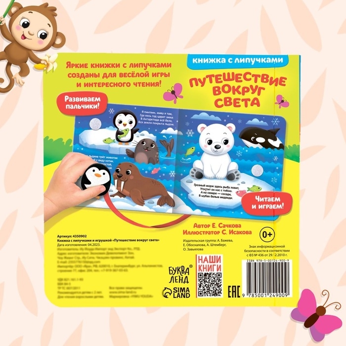 Книга уникальна тем, что в наборе есть мягкая игрушка на ленточке. Малыш сможет прикреплять её на странички с помощью липучек. Скорее отправьте маленького пингвинёнка в увлекательное путешествие!