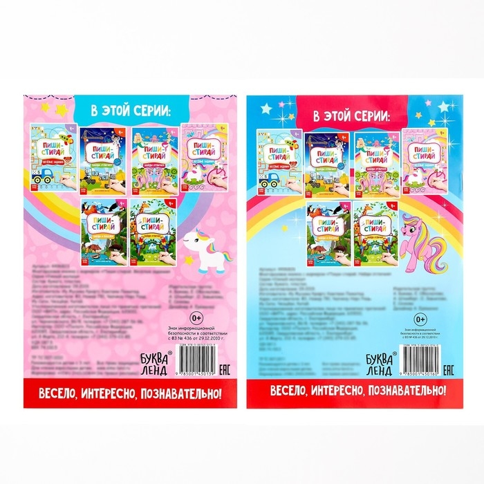 В каждой книге 12 страниц. Они выполнены из бумаги, а маркер — из пластика. Издание рекомендовано детям старше 4 лет.
