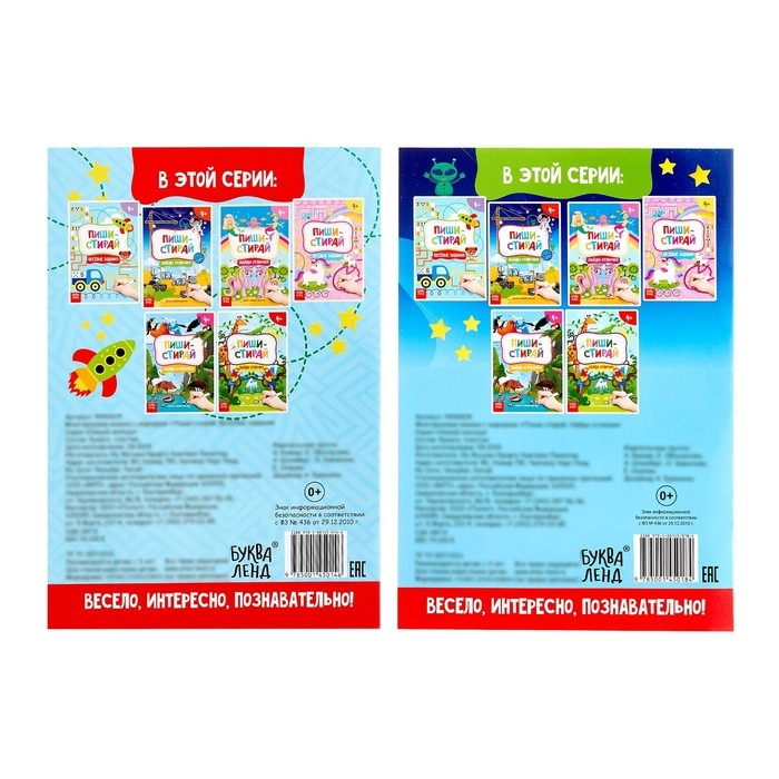 В каждой книге 12 страниц. Они выполнены из бумаги, а маркер — из пластика. Издание рекомендовано детям старше 4 лет.