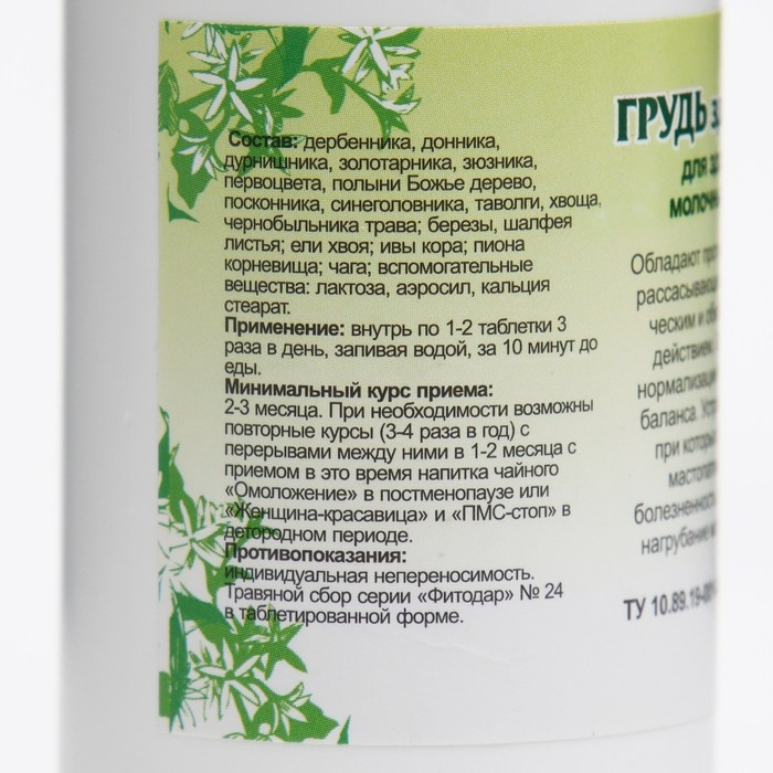 Состав: астрагала, болиголова, буквицы, горца, дербенника, донника, дурнишника, зюзника, первоцвета, подмаренника, полыни Божье дерево, посконника, синеголовника, хвоща, чернобыльника, шалфея трава, берёзы, шалфея листья, ели хвоя, ивы кора, чага, вспомогательные вещества лактоза, аэросил, кальция стеарат.