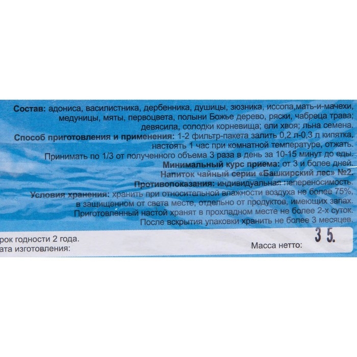 Состав: адониса, дербенника, душицы, зюзника, мать-и-мачехи, медуницы, мяты, первоцвета, полыни Божье дерево, ряски, чабреца трава, гречихи цветущие верхушки, девясила, солодки корневища, ели хвоя, льна семена.