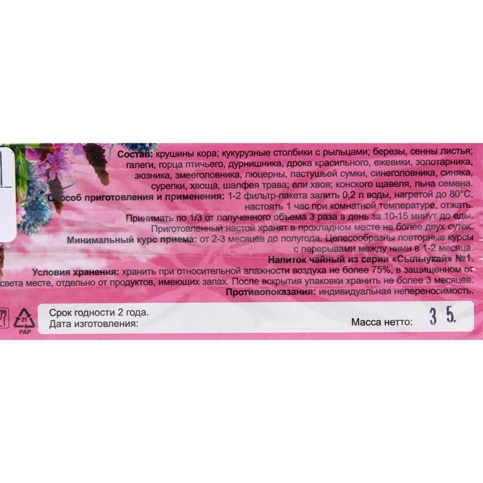 Состав: Сенны листья; крушины кора; льна семена; дербенника, первоцвета (или астрагала), шалфея, дурнишника, зюзника, водяного перца, дрока, золотарника (или подмаренника цепкого),люцерны, пастушьей сумки, синеголовника, синяка, спорыша, хвоща, галеги трава; ели (сосны) хвоя; березы, ежевики, кукурузные рыльца со столбиками.