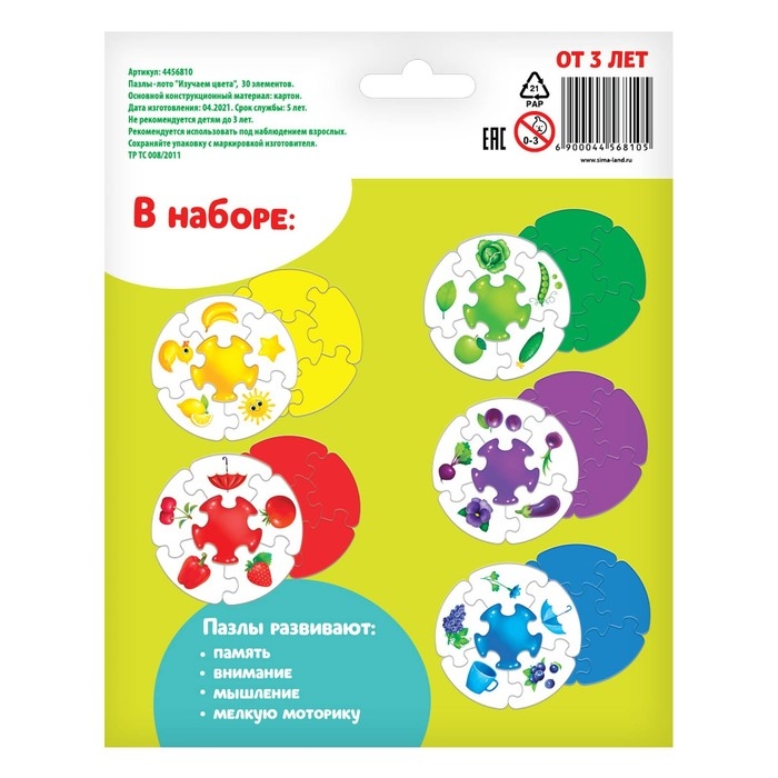 Занимаясь с лото-пазлами, ребёнок выучит основные цвета, научится находить связь между частью и целым, потренирует память, внимание и логическое мышление.