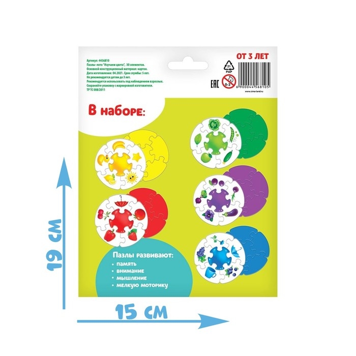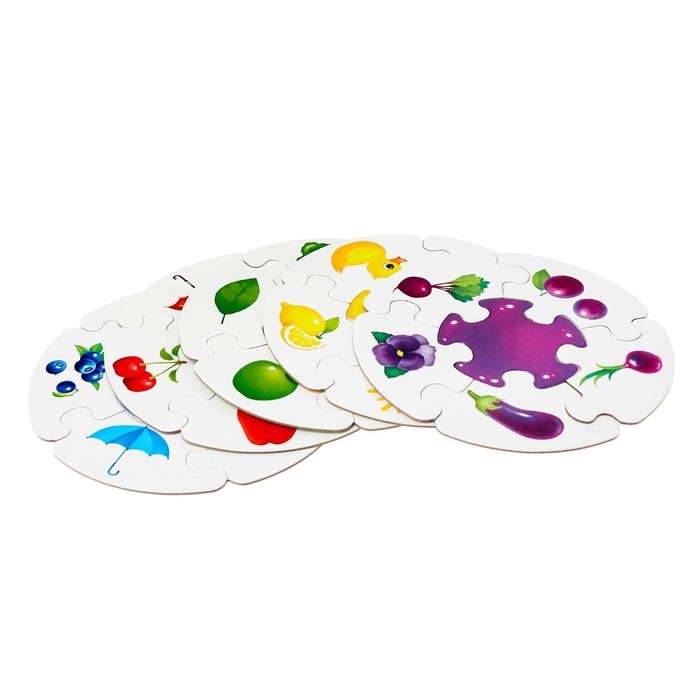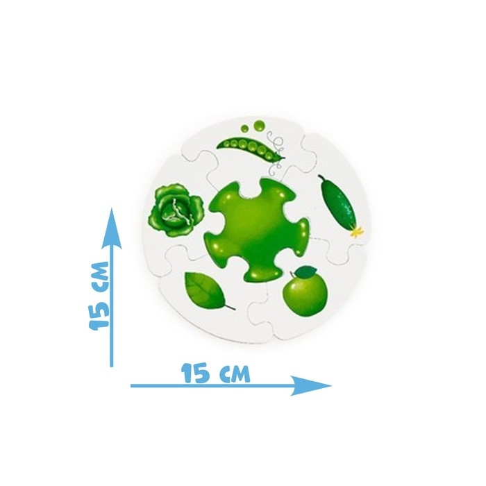 - Из 30 деталей ребёнок соберёт 5 круглых пазлов диаметром 15 см.