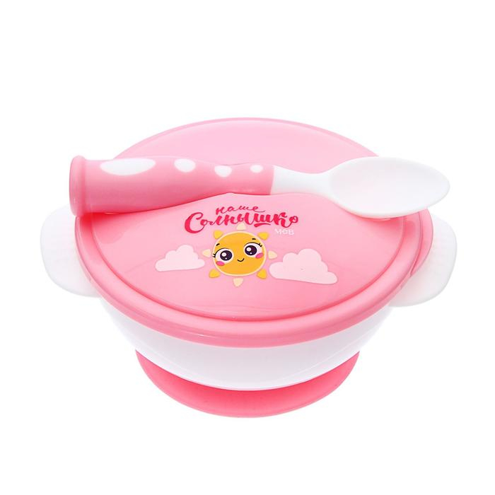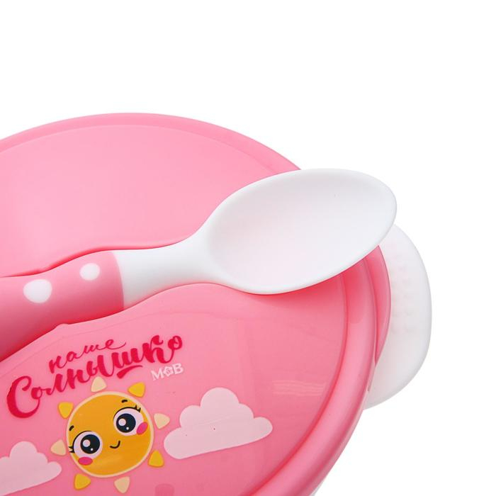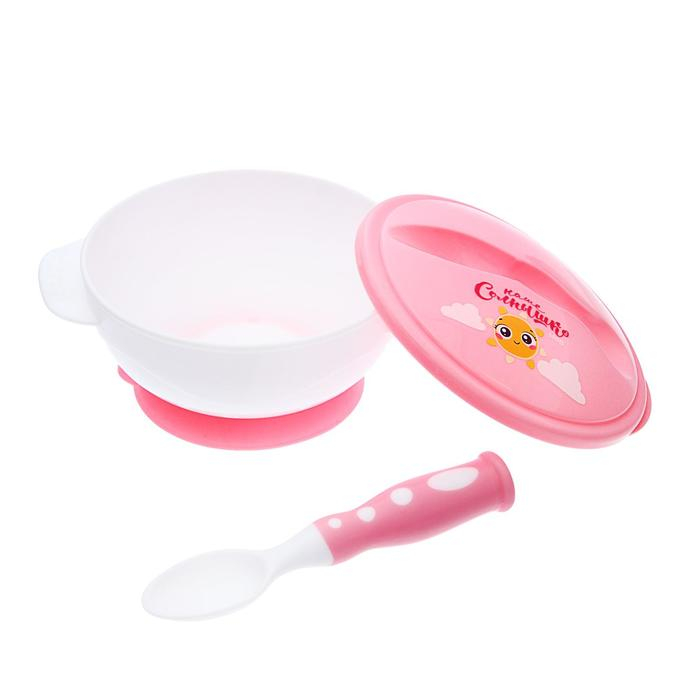 Набор детской посуды «Наше солнышко», 3 предмета: тарелка на присоске, крышка, ложка, цвет розовый