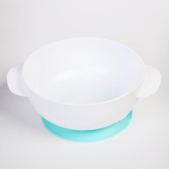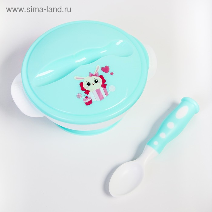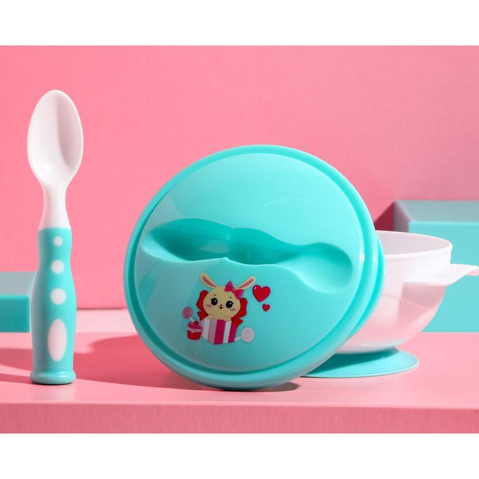 Набор детской посуды «Зайчик», 3 предмета: тарелка на присоске, крышка, ложка, цвет бирюзовый