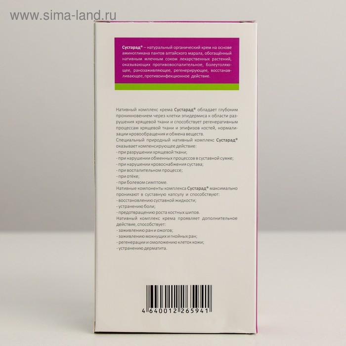 Сустарад® – натуральный органический крем на основе аминогликана пантов алтайского марала, обогащённый нативным млечным соком лекарственных растений, оказывающих противовоспалительное, болеутоляющее, ранозаживляющее, регенерирующее, восстанавливающее, противоинфекционное действие.