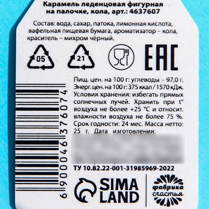 Состав: вода, сахар, патока, лимонная кислота, вафельная пищевая бумага, ароматизатор – кола, краситель - михром чёрный.
